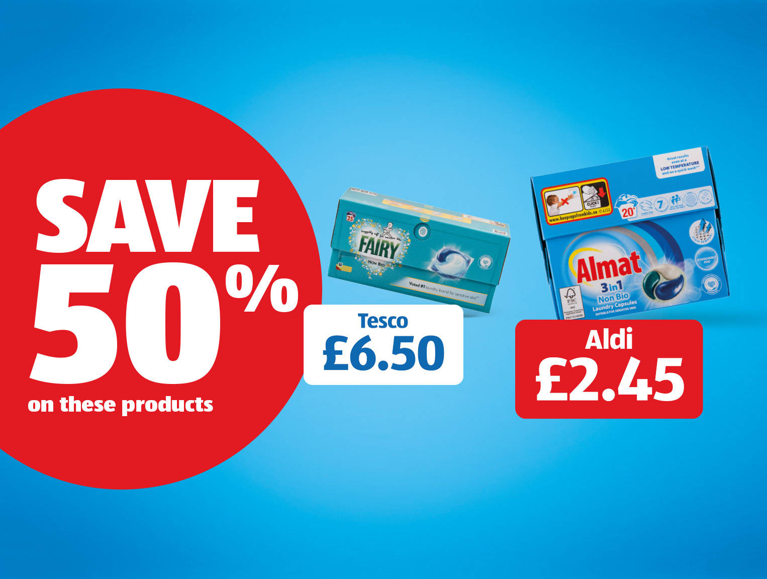 Based on a comparison of products shown only. Tesco may sell other products at different prices. Checked on Tesco.com on 22/01/25. †Clubcard prices excluded. Aldi price and packaging correct as of 22/01/25. Tesco Fairy Non Bio Washing Pods 25 Washes, 26p per wash. Aldi Almat Triple Chamber Laundry Capsules 20 Washes, 12p per wash. Product packaging and prices may differ in Scotland, Wales and Aldi Local.