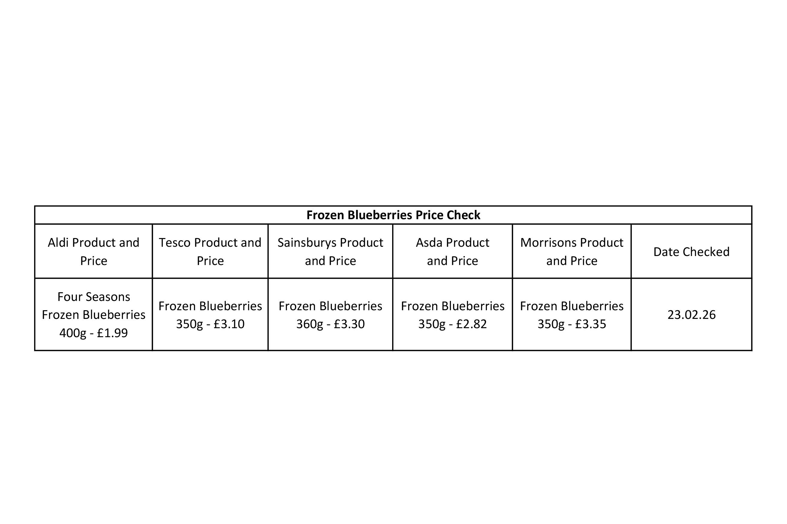 Frozen Blueberries 400g, £4.98 per kg. Aldi price on Frozen Blueberries lowest as of 23/02/26. Prices checked at Tesco, Asda, Sainsbury’s and Morrisons on comparable products every week with any Aldi price adjustment within 11 days. Prices pro-rated. Loyalty card prices and multi-buy offers excluded. Subject to availability, photography shows serving suggestion only. Aldi product packaging and prices may differ in Scotland, Wales and Aldi Local.