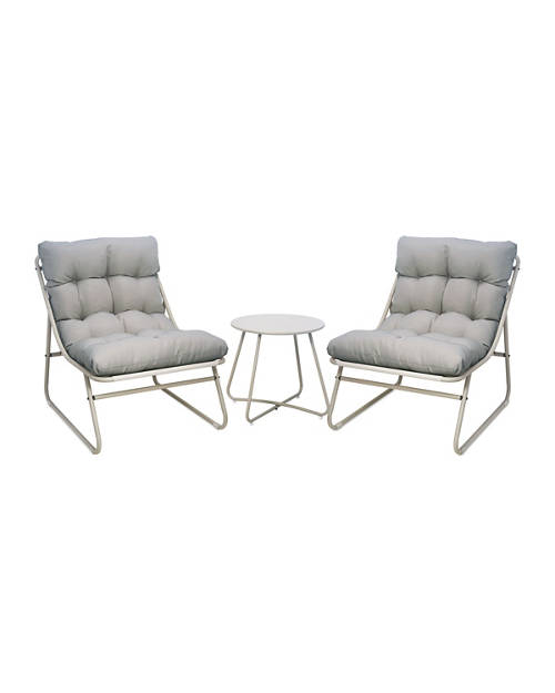 - Includes 2x Cushioned chairs and 1x Round side table