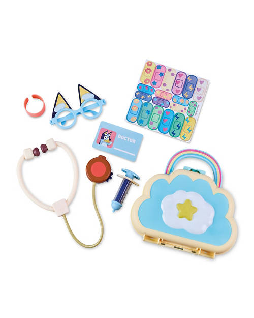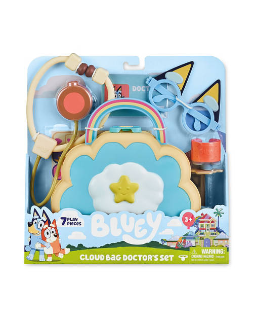 Bring the fun and imaginative play home with Bluey's Cloud Bag Doctor's Set! There are plenty of fun accessories to help heal your patient including a toy Stethoscope, toy "Press & Play" Syringe, toy Bandage, Stickers, a Doctor's Badge and even a pair of Dr. Bluey Glasses! They all Pack into a cute Cloud Bag inspired by the TV show The Cloud Bag is perfect so they can play, store, carry and go!