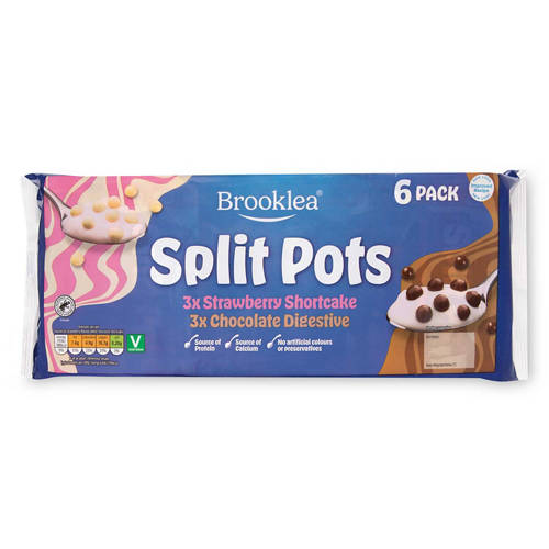 Vanilla flavour yogurt with milk chocolate coated digestive biscuit balls. Strawberry flavour yogurt with white chocolate coated shortcake biscuit balls.