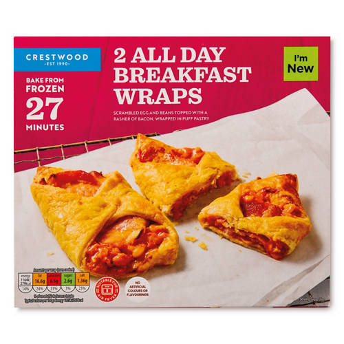 Scrambled egg and beans topped with a rasher of bacon, wrapped in puff pastry.