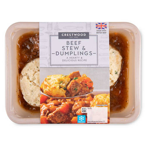 Marinated cooked beef with onion, carrot and swede in red wine gravy with two herb dumplings.