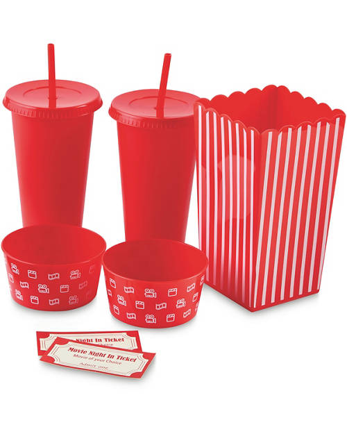 - Includes: 1 x popcorn bucket, 2 x Soda Cups, 2 x Snack Cups, 2 x Movie ticket