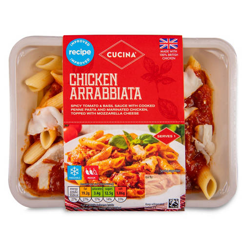 Spicy tomato and basil sauce with cooked penne pasta and cooked marinated chicken breast, topped with mozzarella cheese.