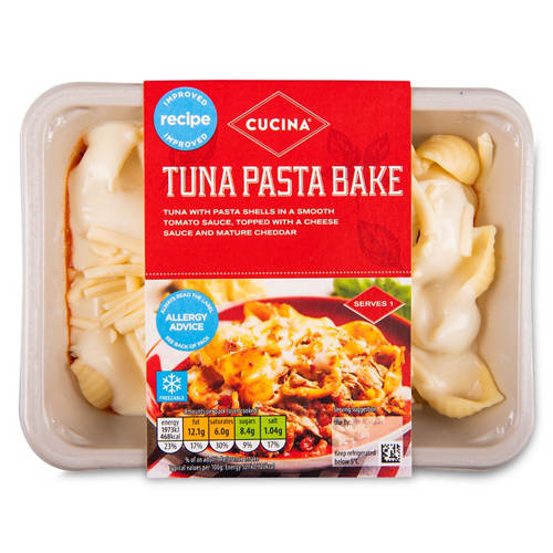 Cooked pasta shells and tuna flakes in a tomato sauce, topped with a cheese sauce and mature cheddar cheese.
