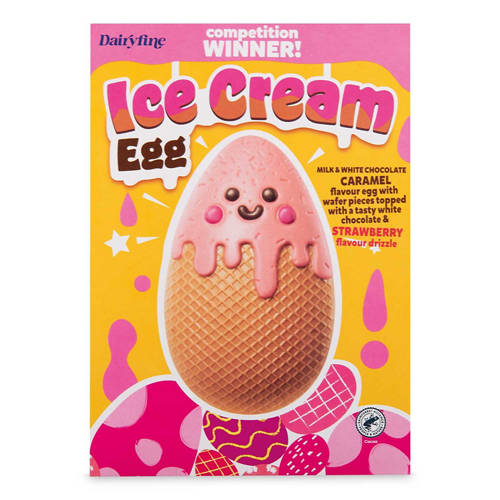Hollow white and milk chocolate caramel flavour egg with wafer pieces and a white chocolate and strawberry flavour topping.