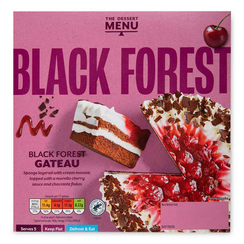 Chocolate flavoured sponge layered with vanilla flavour cream mousse topped with cherry sauce and decorated with dark chocolate flakes.