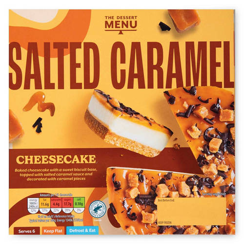 - Salted Caramel Baked cheesecake with a sweet biscuit base, topped with salted caramel sauce and decorated with caramel pieces
