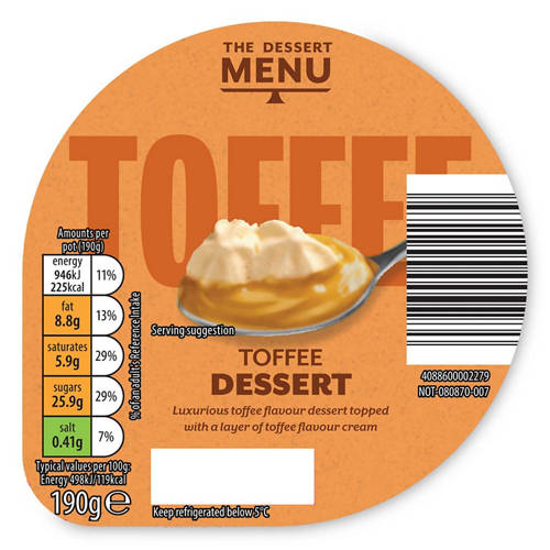 Toffee flavour dessert topped with a layer of toffee flavour cream.
