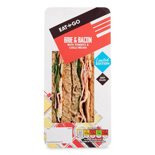 Mould ripened brie cheese with tomato and chilli relish, seasoned mayonnaise, spinach and beechwood smoked streaky bacon on malted bread