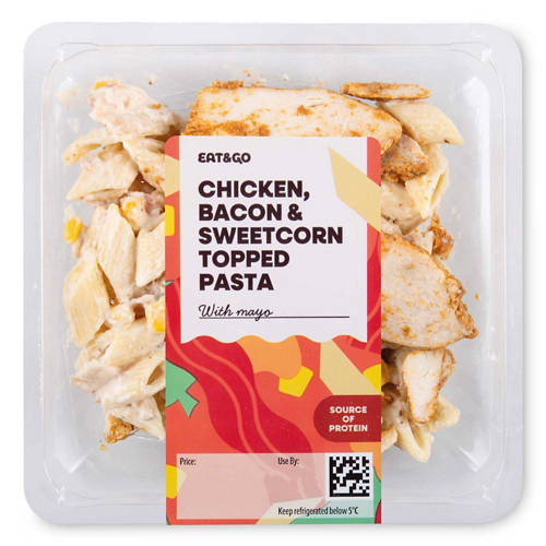 Cooked pasta in a mayonnaise and crème fraîche dressing with sweetcorn, barbecue style marinated cooked chicken, diced tomato, smoked bacon and chives.