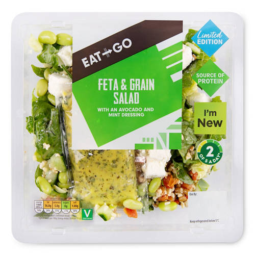Bulgur Wheat, Cos Lettuce, Green Lentils, Diced Cucumber, Spinach, Feta Cheese, Diced Semi Dried Tomato and Edamame Soya Beans, with an Avocado and Mint Dressing.