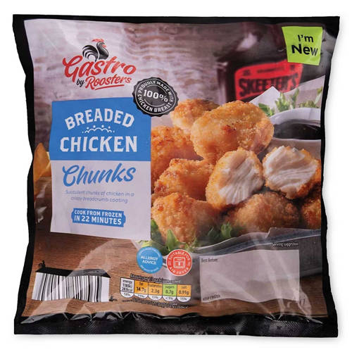 Succulent chunks of chicken in a crispy breadcrumb coating.