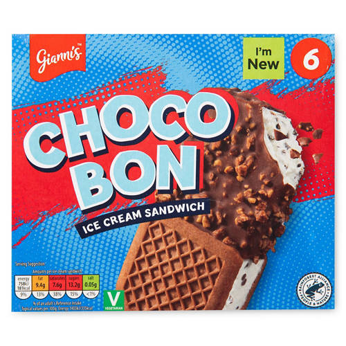 Cream flavour ice cream with dark chocolate chips between chocolate flavoured biscuits, half dipped in a chocolate flavoured coating with hazelnut pieces and waffle crumbs.