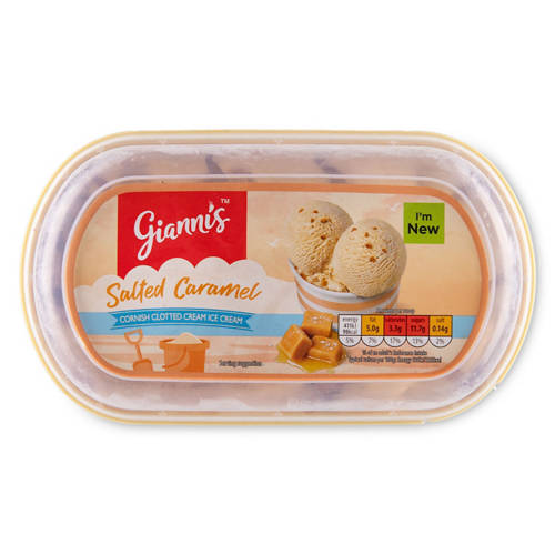 Salted Caramel flavour dairy ice cream made with British whole milk, double cream and Cornish clotted cream with salted caramel sauce and fudge pieces.