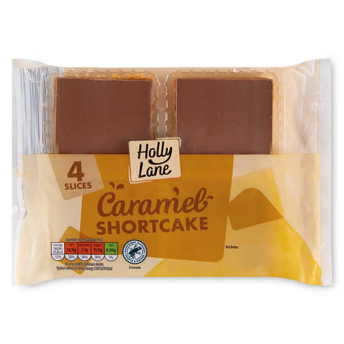 Biscuit base topped with a layer of caramel and milk chocolate.