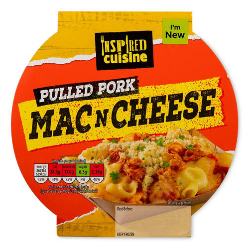 Cooked macaroni pasta in a cheese and barbecue flavour pulled pork sauce, topped with mozzarella cheese and a cheese and dried parsley crumb.