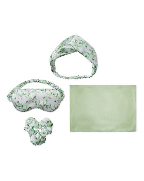 - The set includes a silky satin pillowcase (50 x 70 cm), an eye mask (10.2 x 20.3 cm), a scrunchie (9.5cm outer diameter), and a headband (24 x 6.3 cm)