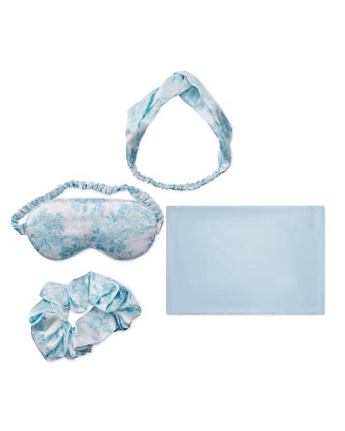 - The set includes a silky satin pillowcase (50 x 70 cm), an eye mask (10.2 x 20.3 cm), a scrunchie (9.5cm outer diameter), and a headband (24 x 6.3 cm)