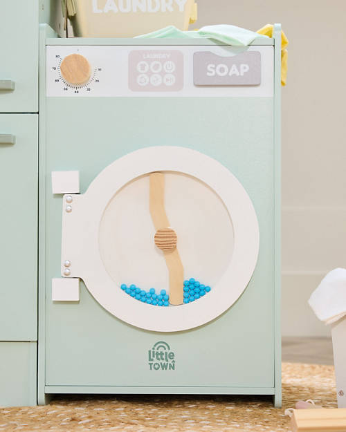 Your little one will love to pretend play washing the clothes just like you. Pop the clothes provided into the washing machine and close the door, turn the dial to the correct washing cycle and there you go!