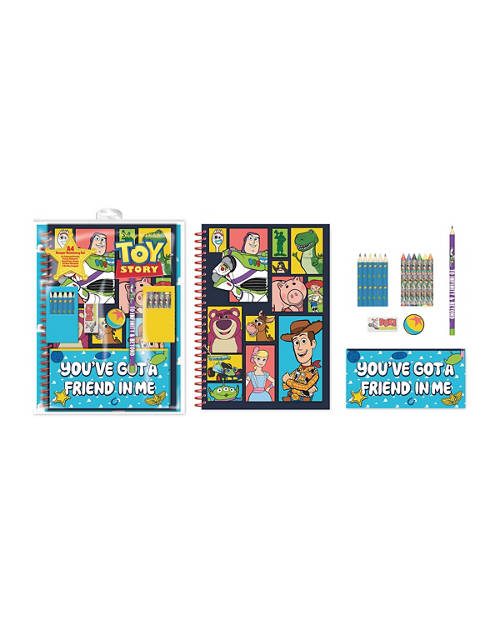 - Includes Zip lock wallet, A4 40 Page Notebook, 6 Crayons, HB Pencil, Sharpener, Eraser, 6 Colouring pencils and PVC flat pencil case