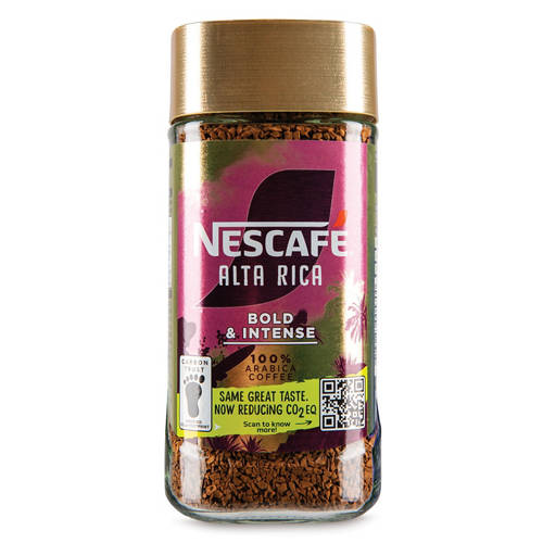 Nescafe Alta Rica is a premium, dark-roasted instant coffee, made from 100% Arabica beans grown in Latin America for an intense, bold flavour with a surprising cacao finish, offering a rich, full-bodied experience.
