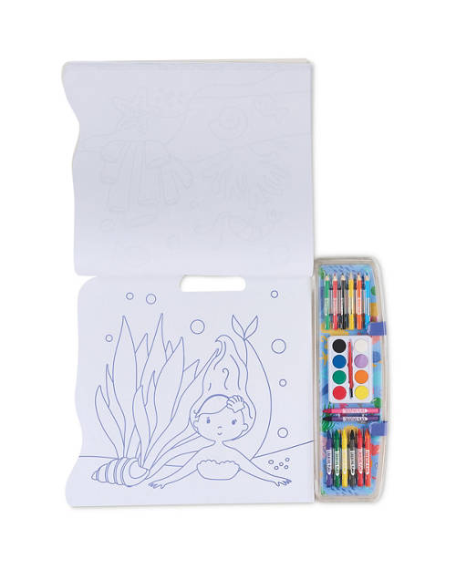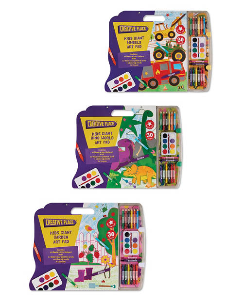 • Includes: 1 x Sticker Sheet, 30 x Colouring Sheets, Clear Hard Plastic, Kids Colouring Pencils, Wax Crayons, Shaped Watercolour Paint Pans in plastic tray, Plastic Handled Paintbrush