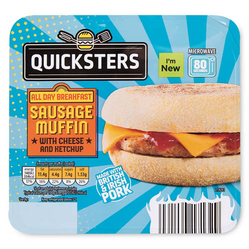 A sausage patty in an English muffin, with a cheese slice and a sachet of tomato ketchup