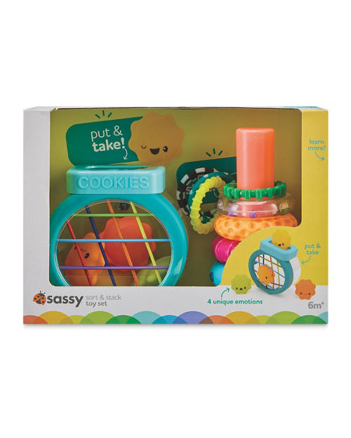 - Choose from Cascading Colours Toy Set, Cookie Jar & Ring Stacker Toy Set or Busy Baby Sensory Toy