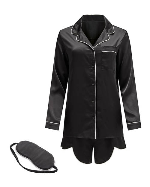 - Sleep set includes button up top, shorts and eye mask