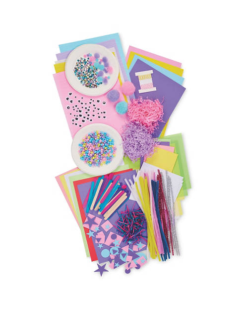 • Includes: Beads Pompoms, Foam Shapes, Foam Sheets, Card Blanks, Envelopes, Paper Plates, Coloured Paper, Googly Eyes, Sequins, Coloured Match Sticks, Crepe Paper, Tissue Paper, Pipe Cleaners, Craft Sticks, Twine and Shredded Tissue Paper