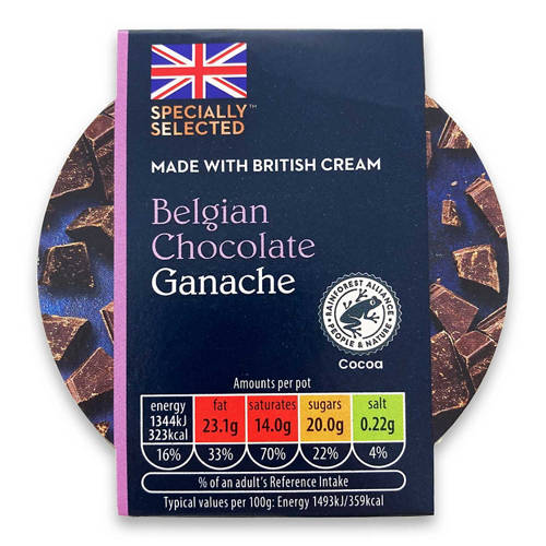 Chocolate ganache made with Belgian dark chocolate, whipping cream and topped with Belgian milk chocolate curls.