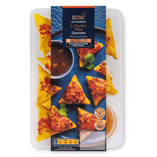 9 Chicken Tikka Samosas with mango chutney dip