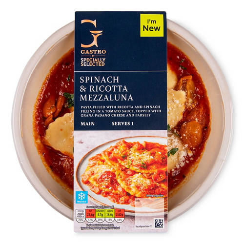 Mezzaluna pasta filled with ricotta and spinach filling in a tomato sauce and topped with Grana Padano cheese and parsley.