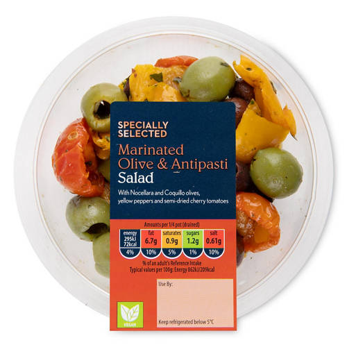 Pitted green and black olives with yellow peppers and tomatoes marinated in oil and basil.