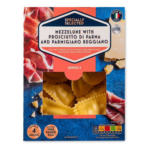Fresh free range egg pasta with a Prosciutto di Parma, Parmigiano Reggiano and ricotta cheese filling.