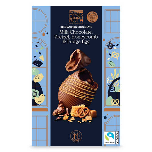 Hollow milk chocolate egg with pieces of honeycomb and pretzel in the shell.