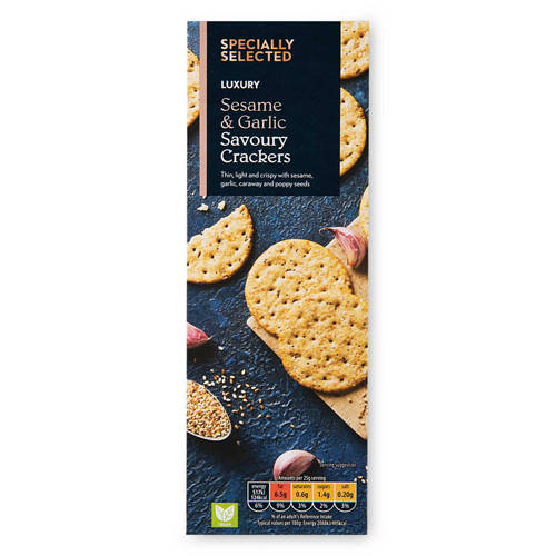 Wheat flour crackers with sesame, garlic, caraway and poppy seeds.