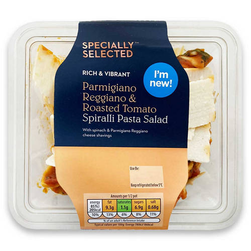Cooked pasta with roasted tomatoes, spinach and Parmigiano Reggiano cheese shavings, in a tomato dressing.