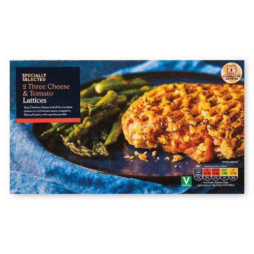 Crumbed Cheshire, halloumi and medium fat semi-hard cheeses in a tomato sauce, encased in puff pastry with a dried parsley sprinkle