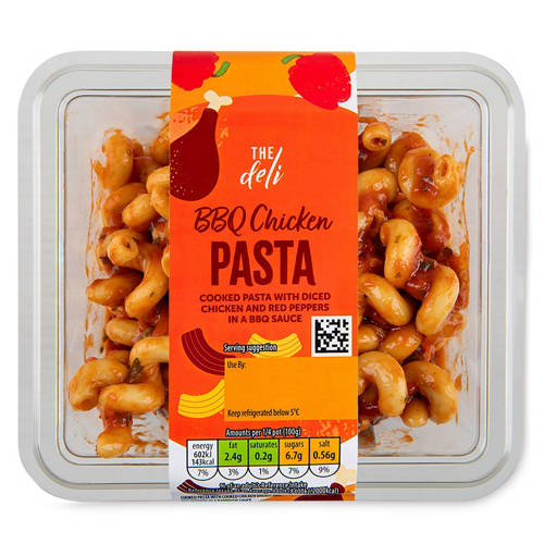 Cooked pasta with cooked chicken breast and red peppers in a barbecue sauce.