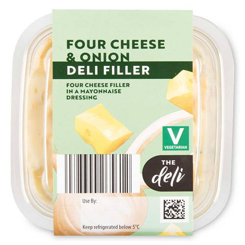 Full fat cheddar cheese with onion, mature coloured Cheddar cheese, red Leicester cheese and medium fat soft cheese in a mayonnaise dressing.