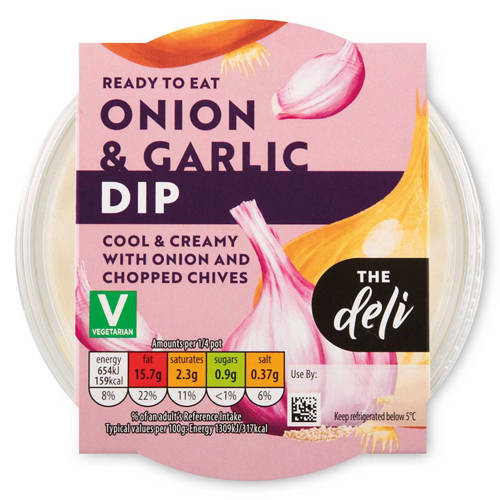 A mayonnaise and soured cream based dip with onion, garlic purée and chives.