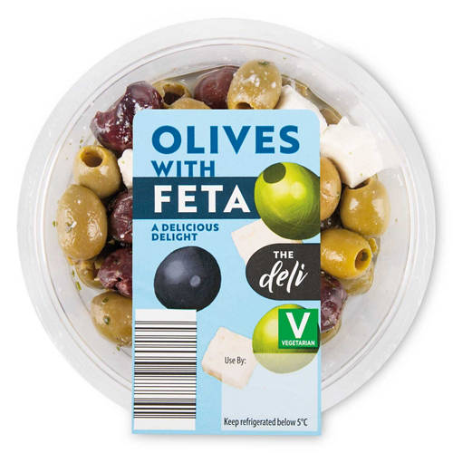 Pitted green and black olives with Feta cheese marinated in a parsley dressing.