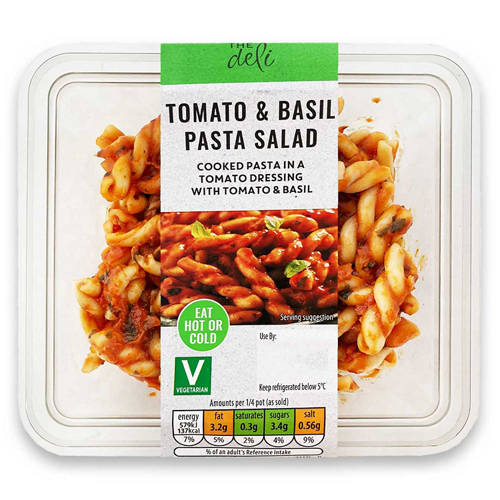 Cooked pasta in a tomato dressing with tomato and basil.