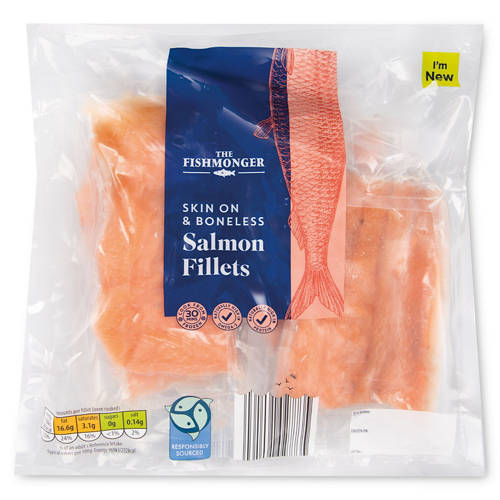 4 raw, frozen, skin-on & boneless Atlantic salmon fillets