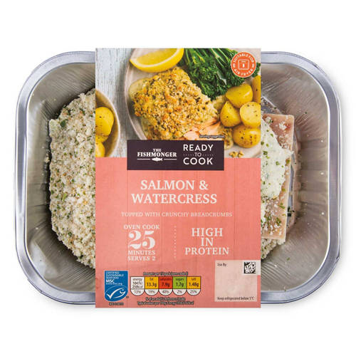 Skinless and boneless salmon portions with a cheddar cheese, watercress and mustard sauce, with a breadcrumb topping.