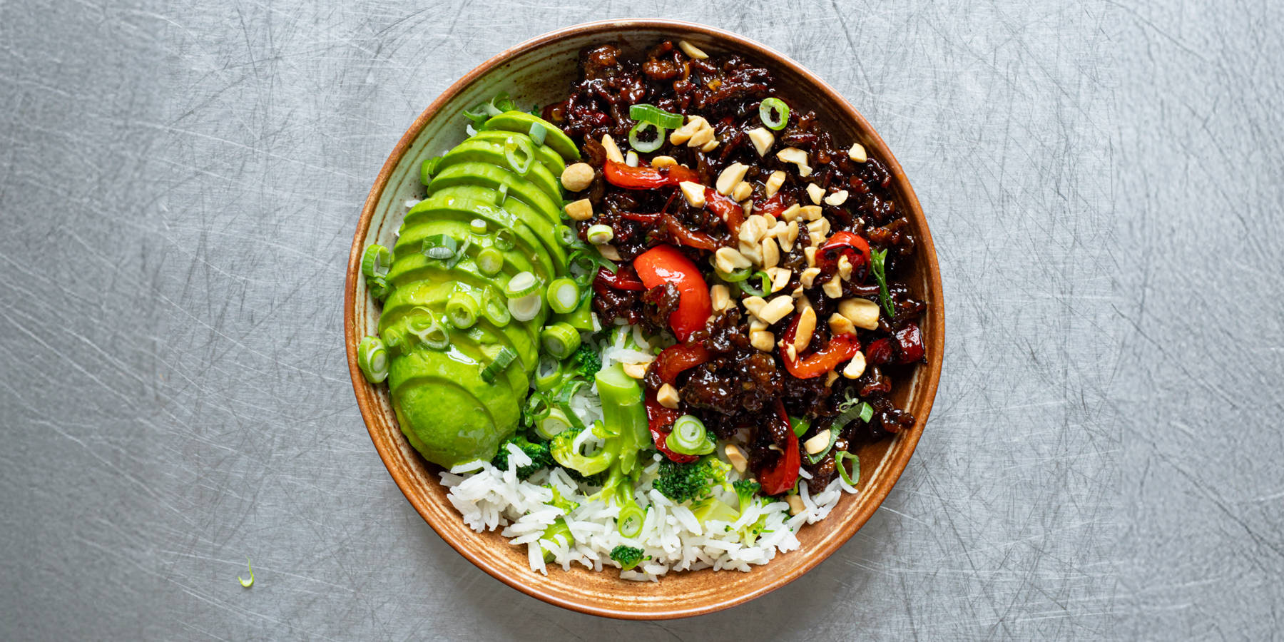 - Divide the broccoli rice between bowls and top with the crispy sweet chilli beef. Finish with the crushed peanuts, spring onion greens and avocado. Serve with lime wedges for squeezing.