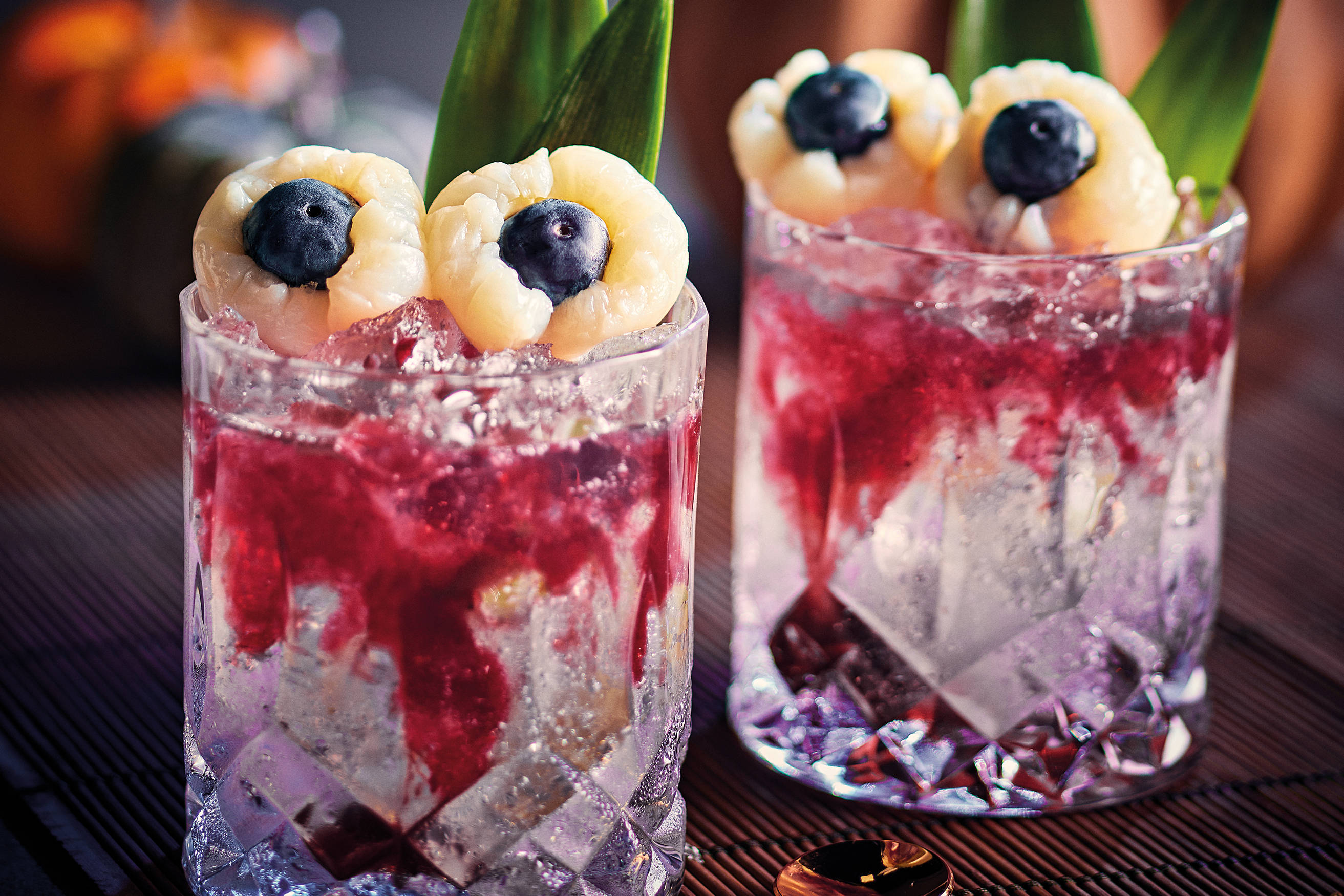 - Make the garnish by placing the blueberries inside the lychees to resemble two eyeballs.